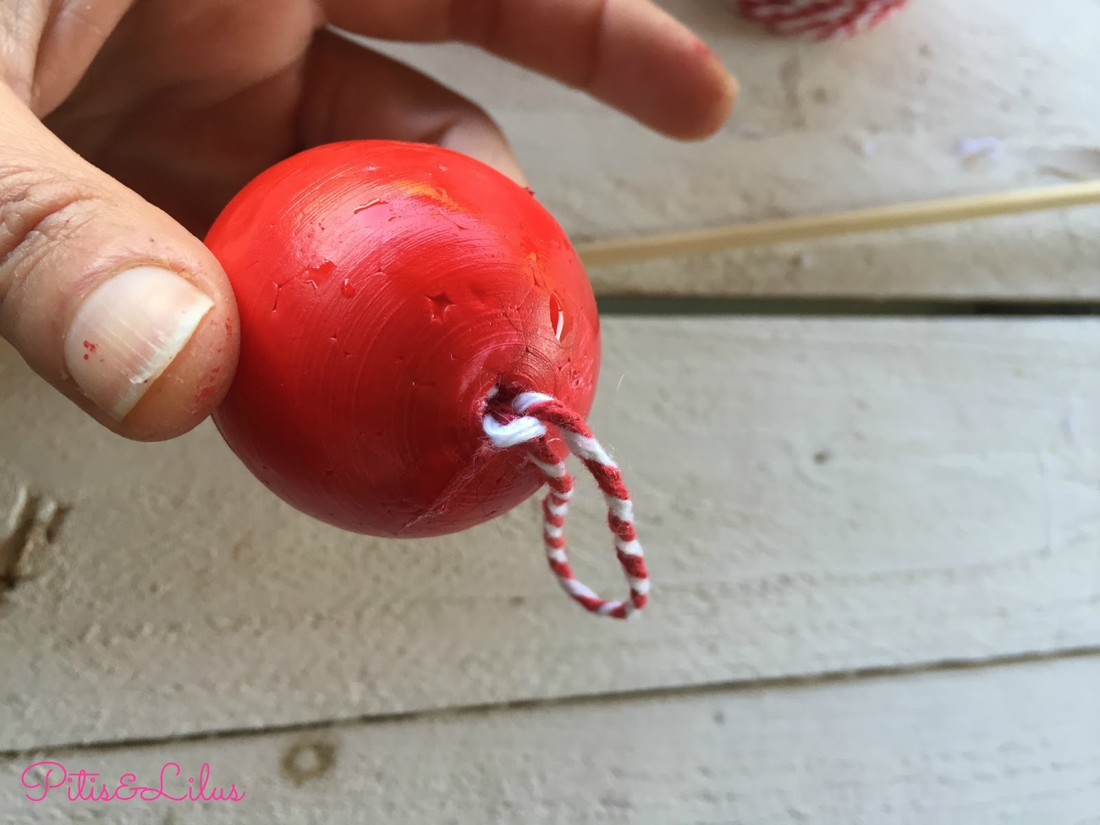 Una vez bien cubiertos, los hemos dejado secar. Una vez que hemos visto que estaban perfectamente secos hemos cortas o un trocito de cordón (a ojo chicas, teniendo en cuenta que tiene que entrar en la rama del árbol después). Aprovechando el agujero que había quedado con el truco del palillo, hemos aplicado un pelín de adhesivo, y ayudadas por el propio palo hemos introducido el cordón en la bola.