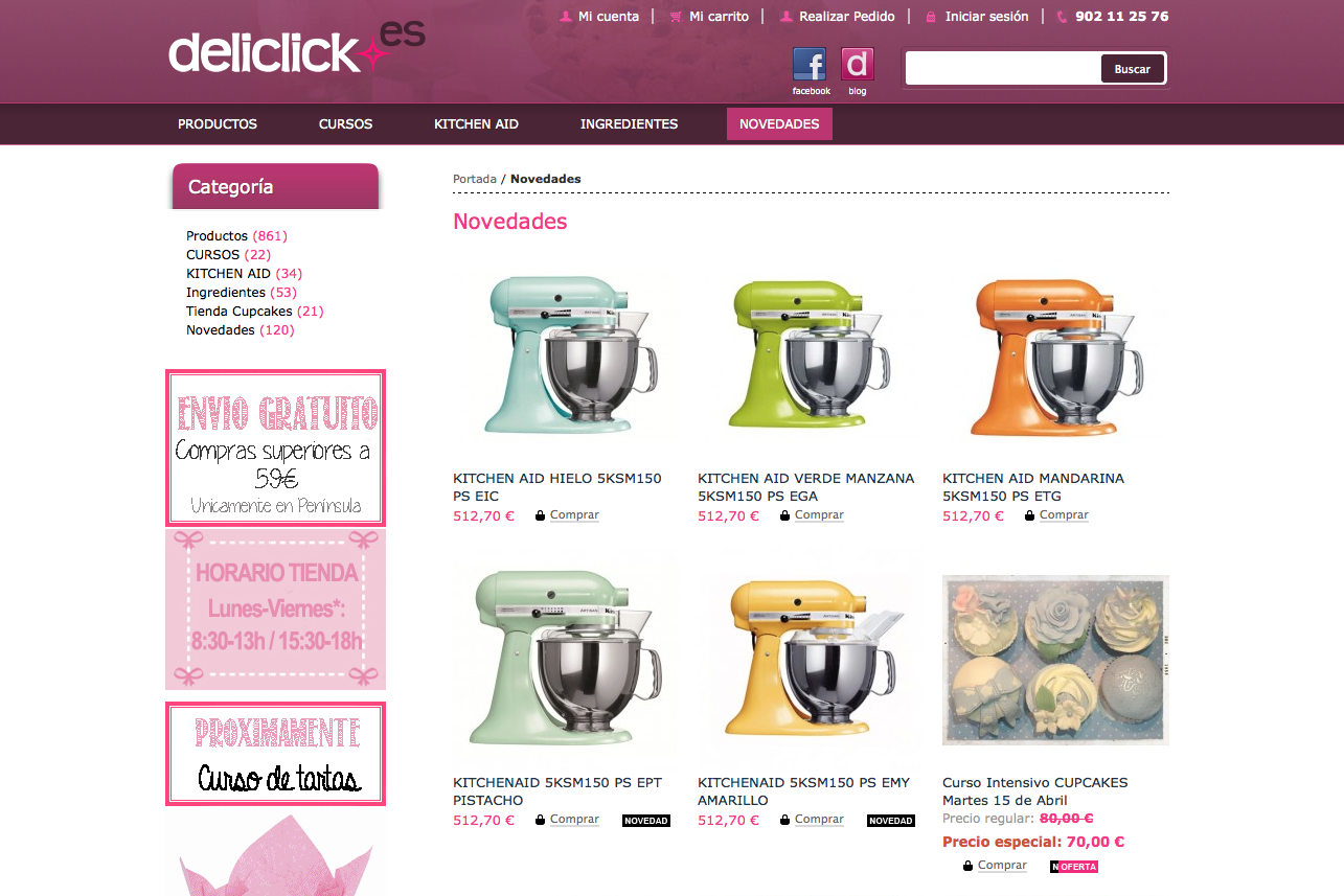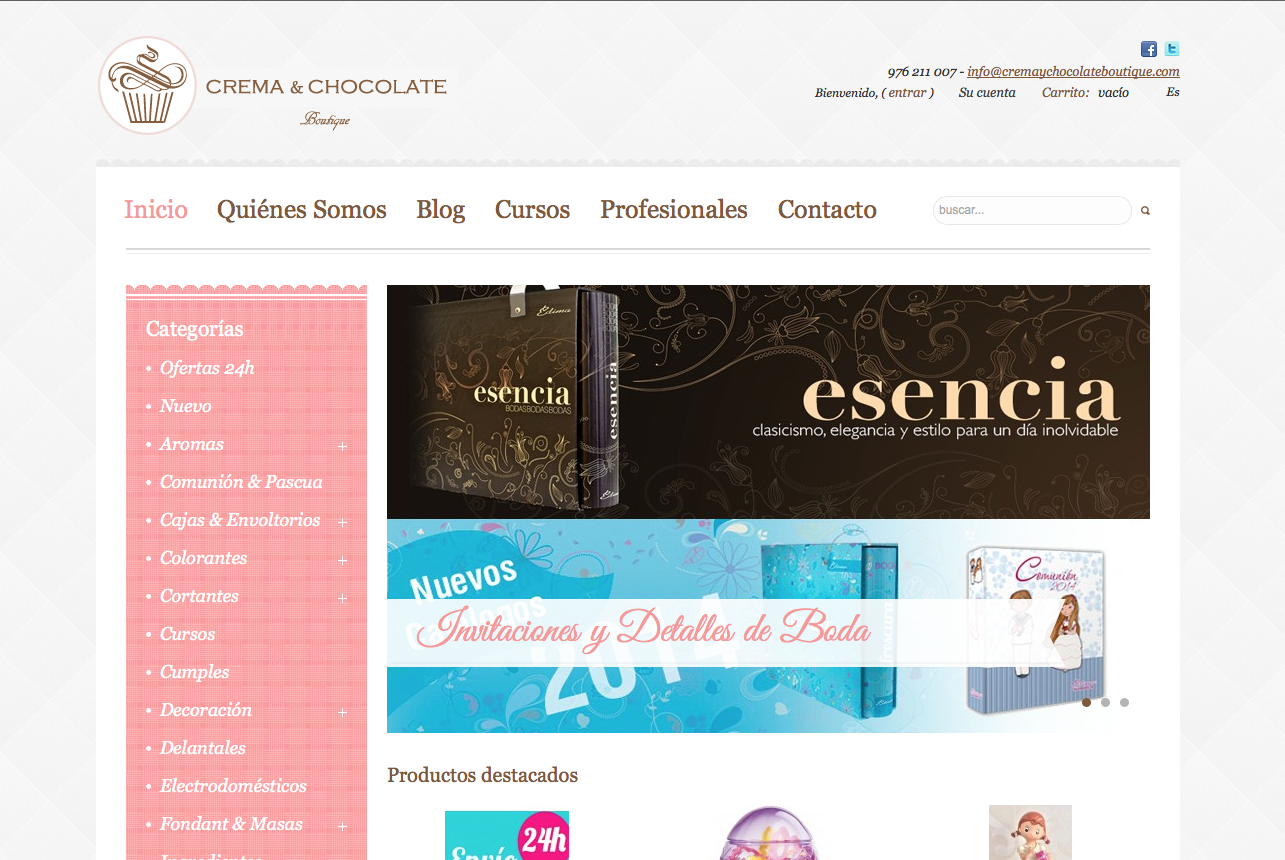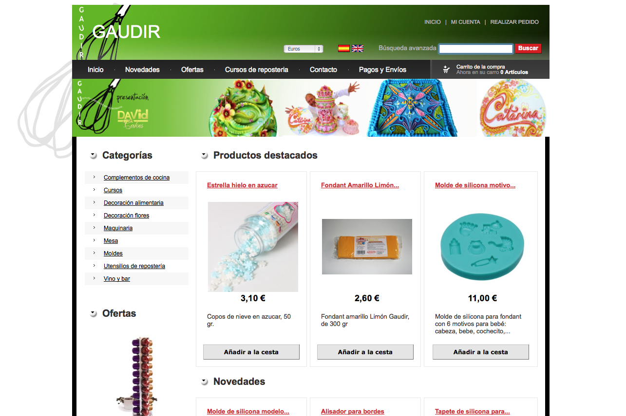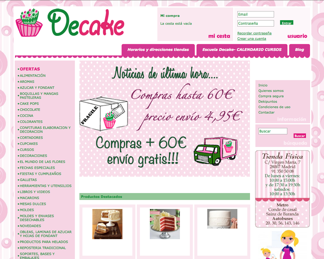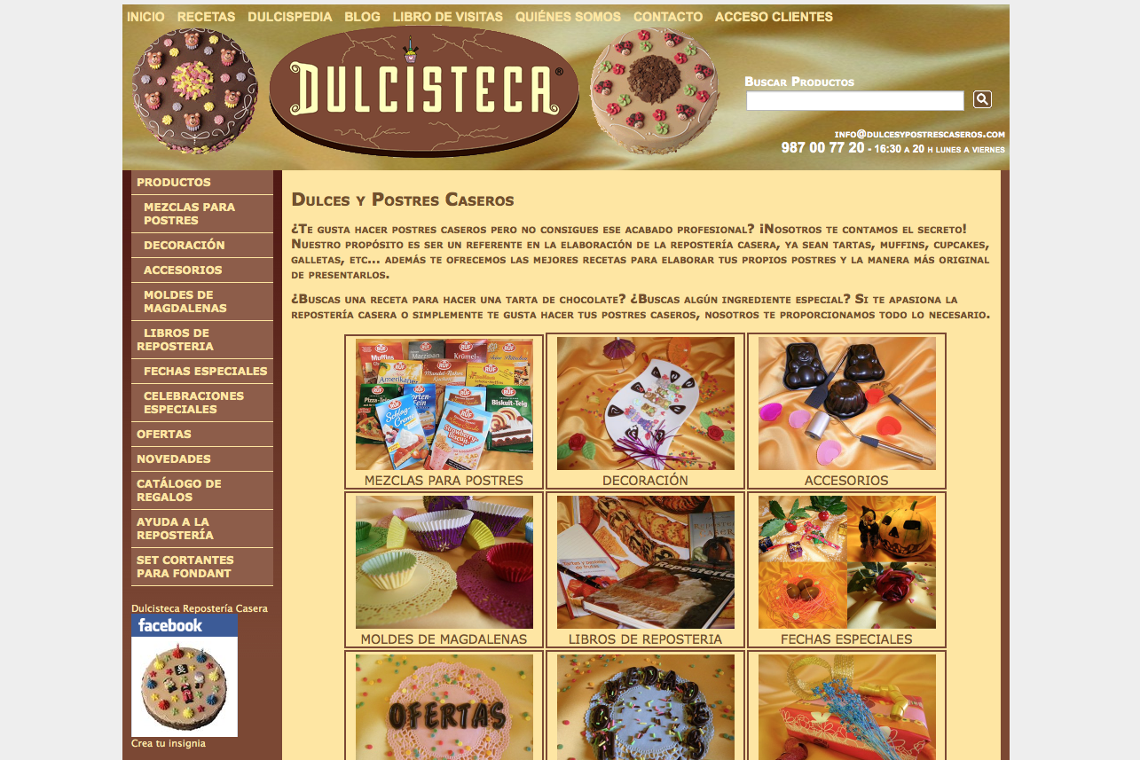Todo tipo de materiales, ingredientes, herramientas y libros. A tener en cuenta es su sección de productos sin gluten que nos ofrecen. En su blog podéis disfrutar de sus venturas y desventuras. Muy salados los delantales que podemos encontrar. No podemos olvidarnos de sus cursos y talleres.
